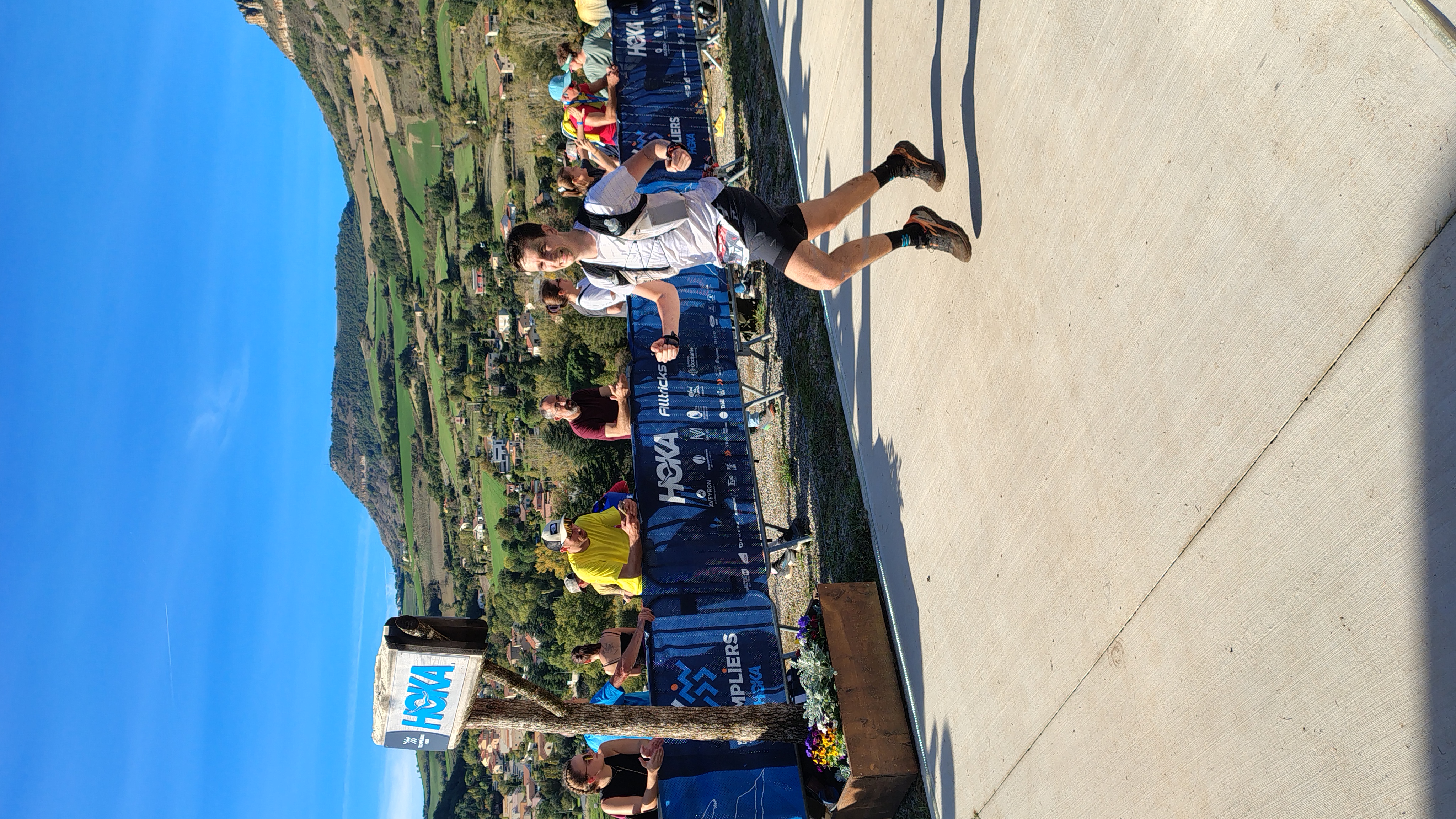Jusque là je reconnaissais les sentiers, mais cette dernière partie c’était le trou noir, de mémoire il restait plus qu’une simple descente. Alors qu’en fait une autre sacré côte bien vénère où un bon nombre de concurrents me doubla, c’est dur, j’en chie … Toutefois la vue est sympa sur la ville de Millau avec le célèbre viaduc au fond, mais à cet instant la chaleur tapait bien (pour un mois d’Octobre). En haut, j’avoue m’être arrêter quelques instants pour reprendre mon souffle.